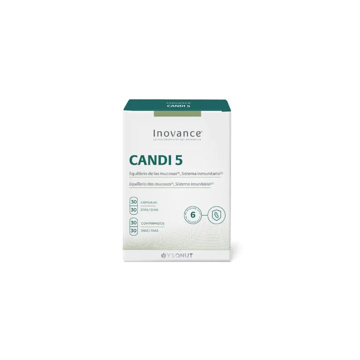 El INOVANCE CANDI 5 es un innovador complemento alimenticio que combina las propiedades de 30 cápsulas y 30 comprimidos, diseñado para mejorar el equilibrio de la flora intestinal y vaginal Su fórmula está especialmente formulada con ingredientes activos que ayudan a mantener la microbiota equilibrada, promoviendo una buena salud digestiva y salud intima. Indicado en mujeres con candidiasis recurrente y/o personas con problemas digestivos.
