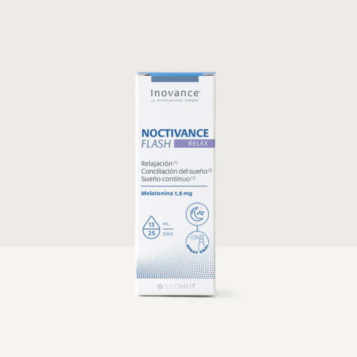 INOVANCE NOCTIVANCE FLASH RELAX es un innovador complemento alimenticio para mejorar la concilación del sueño. Su presentación en spray sublingual permite una absorción rápida, proporcionando un alivio efectivo y inmediato para utilizar antes de irse a la cama o para despertares nocturno.