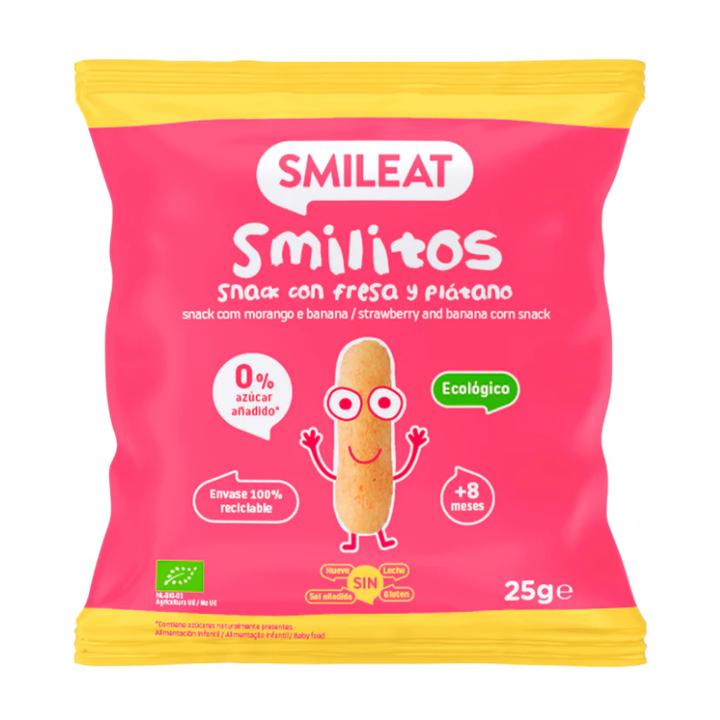 SMILITOS SNACK ECO SMILEAT es un delicioso snack ecológico que combina el sabor natural de la fresa y el plátano en un formato práctico de 25 gramos. Este producto está diseñado para ofrecer una opción saludable y nutritiva, ideal para cualquier momento del día, ya sea como un tentempié entre comidas o un complemento en tus meriendas. La fabricación de estos snacks sigue estrictos estándares de calidad y sostenibilidad, garantizando un producto libre de aditivos artificiales y conservantes.